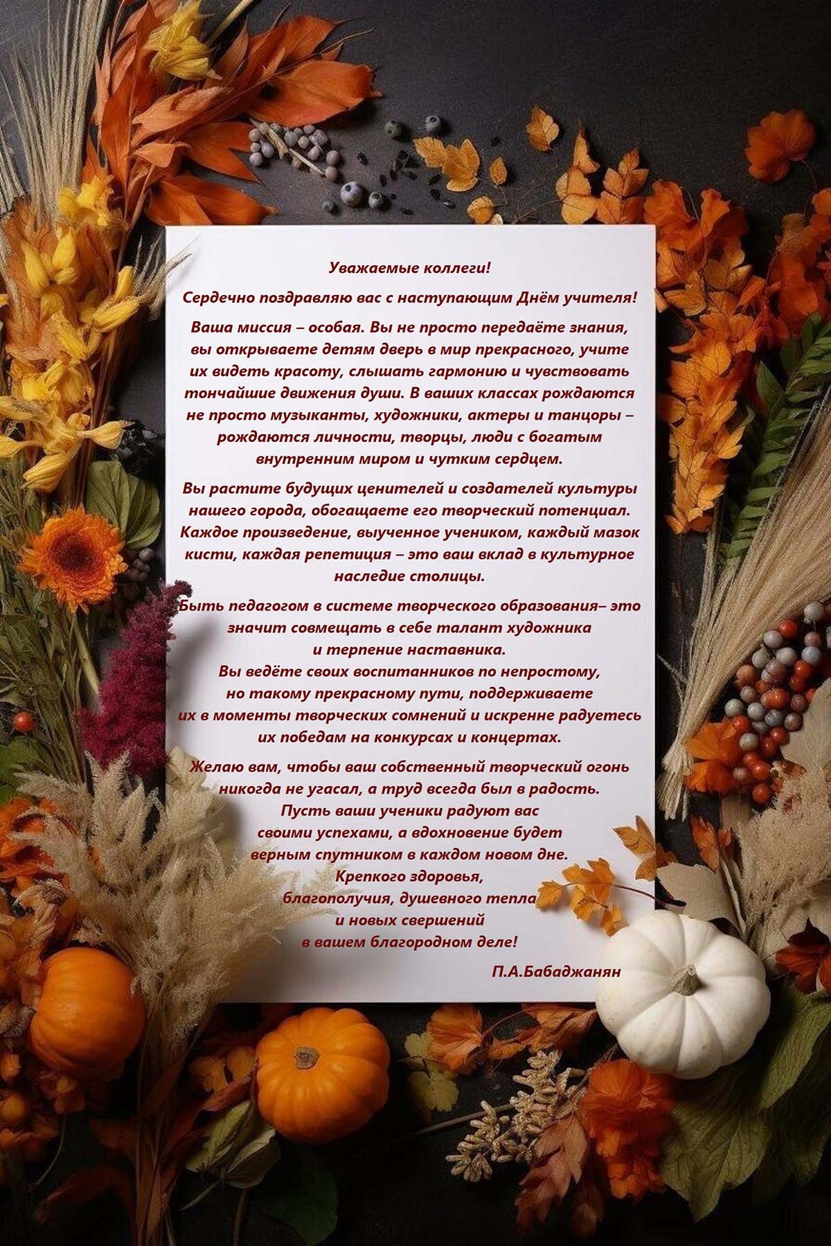 Ваш труд невероятно сложно оценить, ему просто нет цены! Профессия преподаватель сочетает в себе мудрость и молодость души, креативность и огромную энергию, доброту и строгость! Ваш каждодневный путь - это путь к сердцам подрастающего поколения, путь к вершинам знаний. Будьте здоровы, успешны, благополучны, творчески активны. Пусть Ваша энергия никогда не иссякает, а энтузиазм студентов становится лучшей наградой. Желаем запоминающихся уроков, грандиозных идей и гордости за успехи каждого Вашего подопечного.