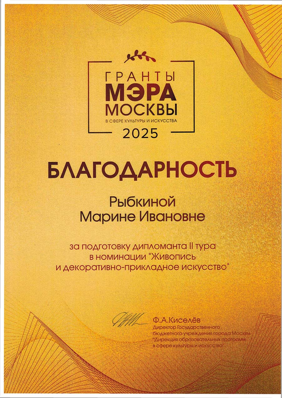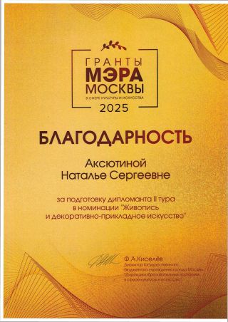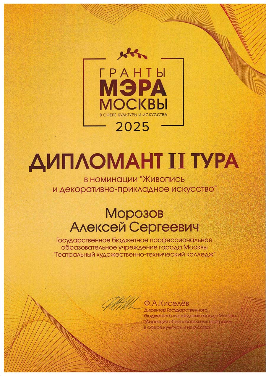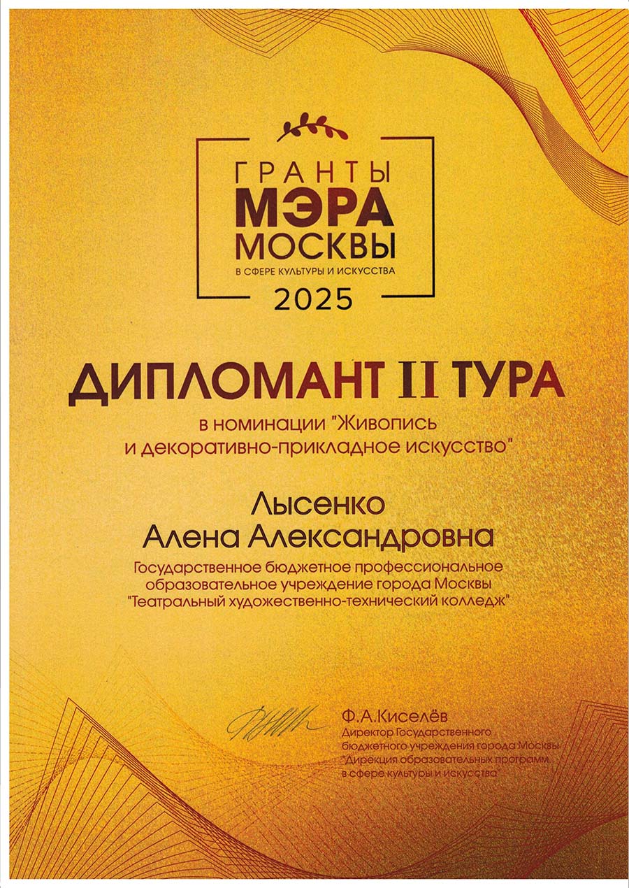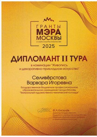 7 апреля 2025 года опубликован список участников II тура Грантов Мэра Москвы в сфере культуры и искусства 2025. Поздравляем студентов ГБПОУ г. Москвы «ТХТК» успешно прошедших в III тур конкурса! Особую благодарность выражаем преподавателям колледжа Рыбкиной Марине Ивановне и Аксютиной Наталье Сергеевне за хорошую подготовку студентов колледжа к участию в конкурсе - Гранты Мэра Москвы в сфере культуры и искусства 2025! Ждём дальнейших Побед!