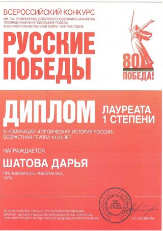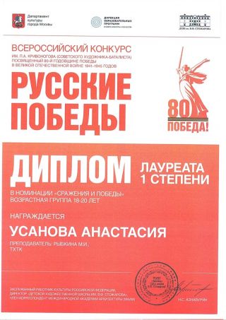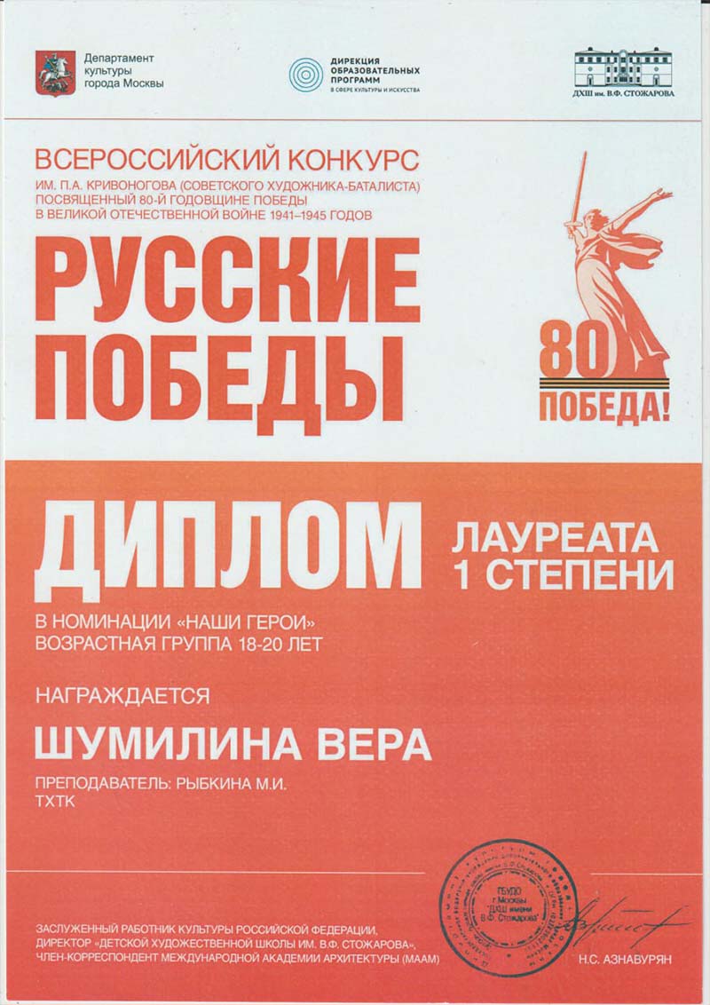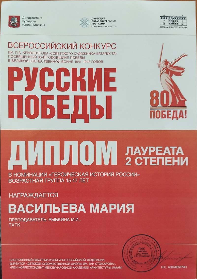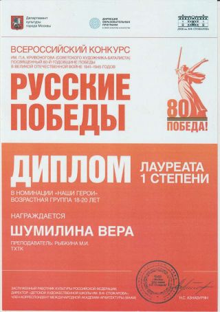 7 мая 2025 года были опубликованы результаты Всероссийского конкурса «Русские победы» им. П.А. Кривоногова, посвященного 80-летию со дня Великой Победы. Студенты нашего колледжа традиционно успешно участвуют в данном конкурсе и этот год не стал исключением: триумфаторами стали студенты ТХТК: 1 место – Шатова Дарья, группа 4Ан/9 - Номинация «Героическая история России»; 1 место – Усанова Анастасия, группа 4Ан/9 - Номинация «Сражения и победы» ; 1 место – Шумилина Вера, группа 2Реклама - Номинация «Наши герои»; 2 место – Васильева Мария, группа 1Ан/9 - Номинация «Героическая история России» Поздравляем студентов и их преподавателя Рыбкину Марину Ивановну! Мы Вами гордимся!
