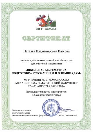 Преподаватель математики, Власова Наталья Владимировна, провела лето 2025 года с пользой, участвуя в летней онлайн-школе при МГУ имени М.В. Ломоносова. |