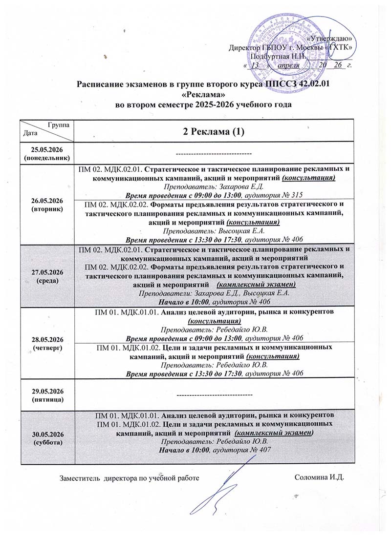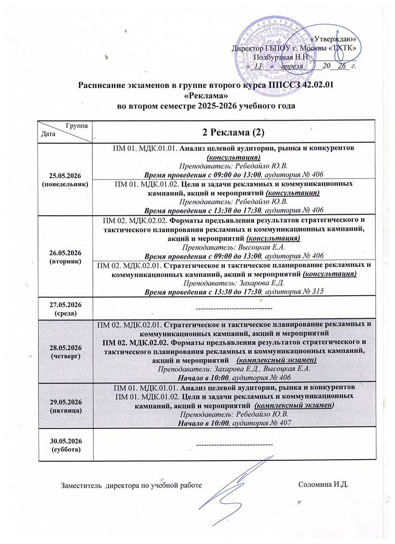 Расписание экзаменациооных просмотров и экзаменов во II полугодии 2025-2026 учебного года в руппах: 4Реклама