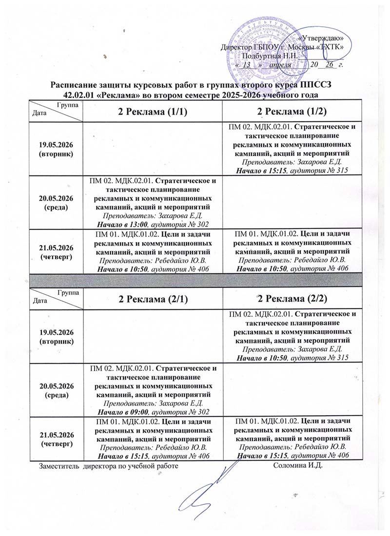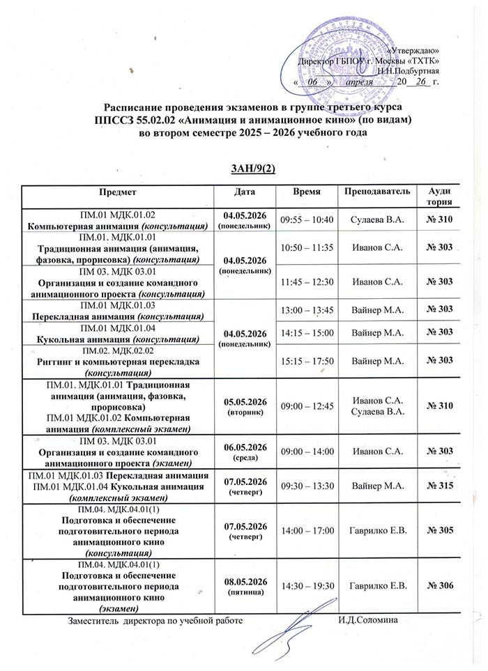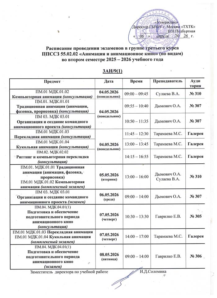 Расписание экзаменациооных просмотров во II полугодии 2025-2026 учебного года в руппах: 3Ан11, 4Ан9, 4Ан9(к), 4ХГО, 4ХГО(к), 4ХКО , 3Реклама, 3Реклама(к), 3Ан9(1), 2Ан9(2), 2Ан11