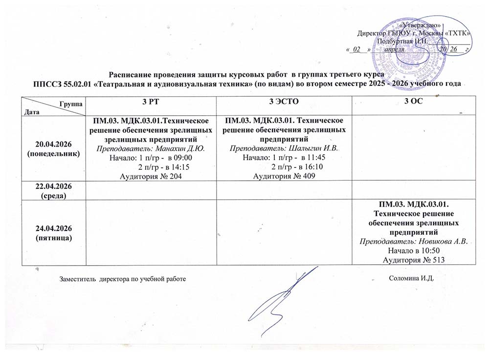 Расписание защиты курсовых работ и экзаменациооных просмотров во II полугодии 2025-2026 учебного года в руппах: 4РТ, 4ЭСТО, 4ОС