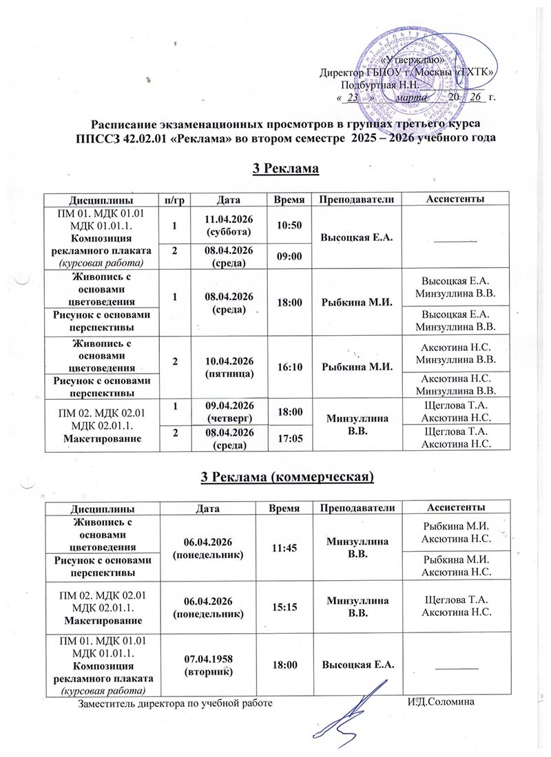 Расписание экзаменациооных просмотров во II полугодии 2025-2026 учебного года в руппах: 3Ан11, 4Ан9, 4Ан9(к), 4ХГО, 4ХГО(к), 4ХКО , 3Реклама, 3Реклама(к)