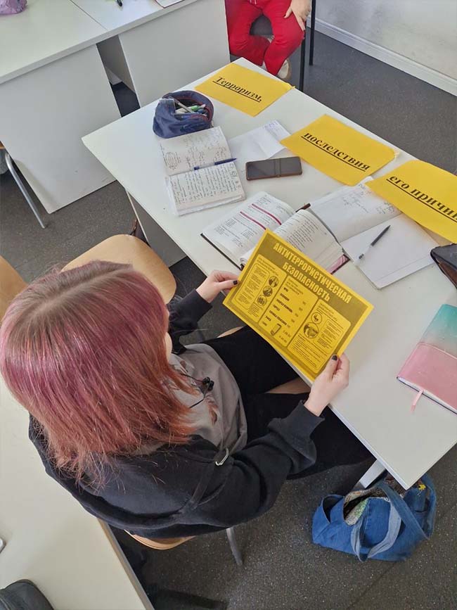 24 сентября 2025 года была проведена информационно-просветительская акция «Действуй правильно при угрозе теракта». В ходе мероприятия студентам были розданы информационные буклеты с рекомендациями о порядке действий при обнаружении подозрительных предметов, угрозе взрыва или захвата заложников. Педагог-психолог Лапина Е.А. ознакомила обучающихся с основными правилами поведения в экстренных ситуациях, подчеркнув важность спокойствия, внимательности и своевременного обращения к представителям правоохранительных органов. Студенты активно участвовали в обсуждении и задавали вопросы, касающиеся личной безопасности. Мероприятие способствовало повышению уровня информированности обучающихся и формированию ответственного отношения к вопросам общественной и личной безопасности.