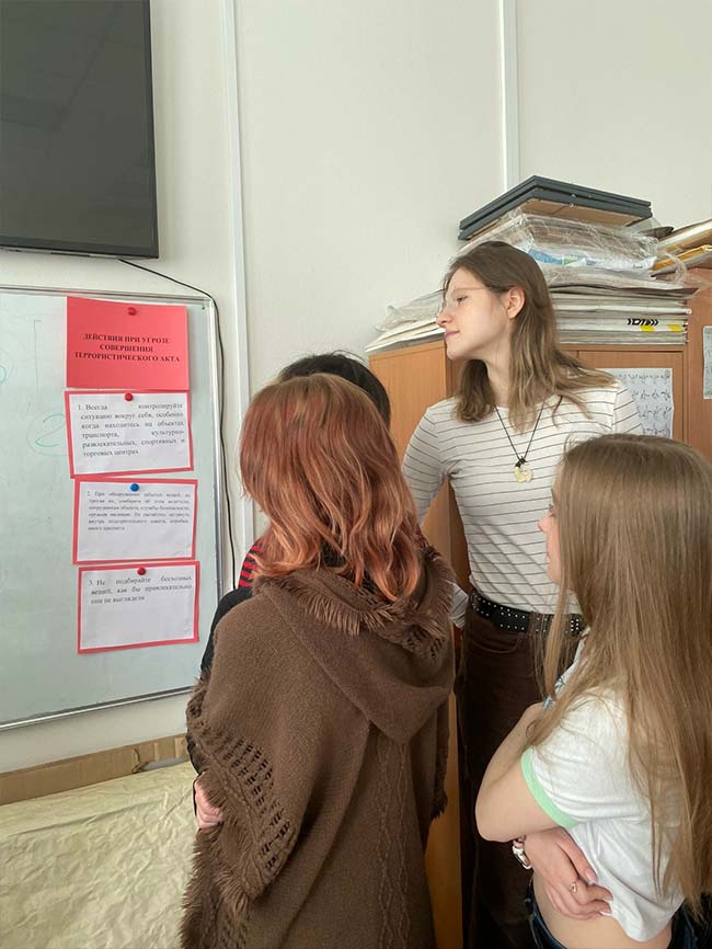 28 апреля 2025 года в колледже была проведена интерактивная лекция «Основы антитеррористической безопасности». В ходе мероприятия заместитель директора по УВР Речкина Л.Я. и педагог-психолог Лапина Е.А. рассказали о правилах поведения при угрозе террористического акта, алгоритмах действий при обнаружении подозрительных предметов и необходимости незамедлительного информирования соответствующих служб. Студентам напомнили об ответственности за заведомо ложные сообщения об угрозах, а также объяснили важность внимательности в общественных местах.