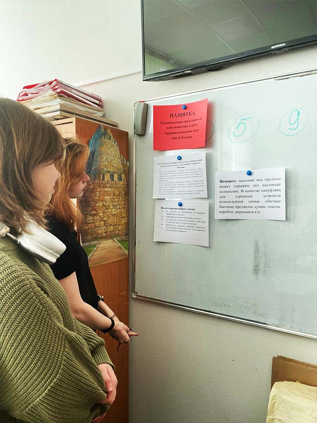 24 сентября 2025 года была проведена информационно-просветительская акция «Действуй правильно при угрозе теракта». В ходе мероприятия студентам были розданы информационные буклеты с рекомендациями о порядке действий при обнаружении подозрительных предметов, угрозе взрыва или захвата заложников. Педагог-психолог Лапина Е.А. ознакомила обучающихся с основными правилами поведения в экстренных ситуациях, подчеркнув важность спокойствия, внимательности и своевременного обращения к представителям правоохранительных органов. Студенты активно участвовали в обсуждении и задавали вопросы, касающиеся личной безопасности. Мероприятие способствовало повышению уровня информированности обучающихся и формированию ответственного отношения к вопросам общественной и личной безопасности.