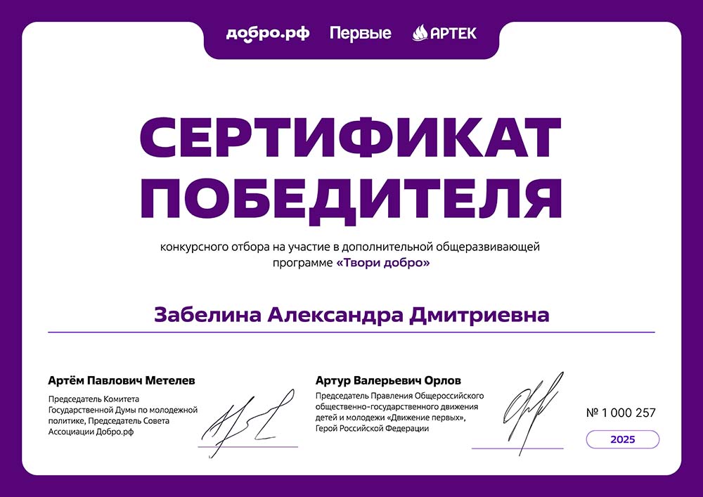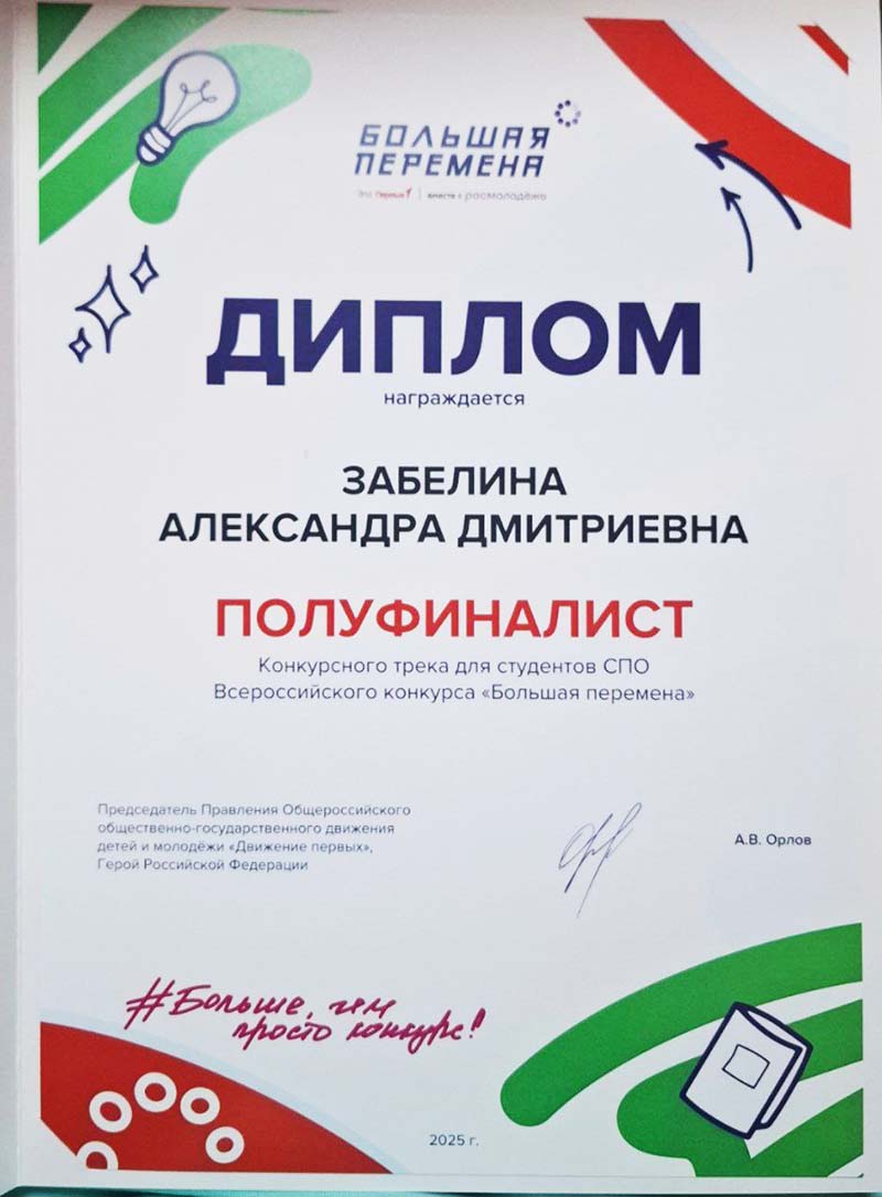 С 17 по 21 ноября 2025 года в Нижнем Новгороде проходил финал Всероссийского конкурса «Большая перемена». Финалистов и гостей приветствовал Президент России Владимир Путин. Общее количество участников в этом году составило 1 190 000 человек, финалистами среди СПО стали 600 из 63 регионов России. Поздравляем студентку нашего колледжа - председателя РДДМ – «ДВИЖЕНИЕ ПЕРВЫХ» ГБПОУ г. Москвы «ТХТК» Забелину Александру Дмитриевну с огромной победой на конкурсе! Она стала Лауреатом II степени конкурсного трека для студентов СПО Всероссийскогконкурса «Большая перемена»! Конкурс проводился при поддержке Минпросвещения России. Участников ждали не только конкурсные испытания, но и насыщенная просветительская программа, в рамках которой эксперты в области образования, просвещения, науки, медиа и креативных индустрий провели тематические активности. Единая тема всех конкурсных этапов шестого сезона – «От мечты к свершениям». В этом году у ребят в рамках конкурса появилась возможность рассказать о своей самой заветной мечте, вместе с командой сделать первый шаг к ее реализации, а также поразмышлять о том, как помогать людям из разных стран исполнять их мечты. Отметим, что флагманский проект Движения Первых «Большая перемена» – самый масштабный конкурс для детей и подростков в России. Мы от всей души поздравляем Александру с этим фантастическим результатом и желаем ей дальнейших успехов, новых идей и покорения ещё больших вершин!