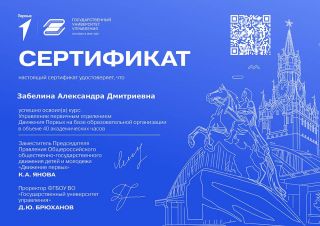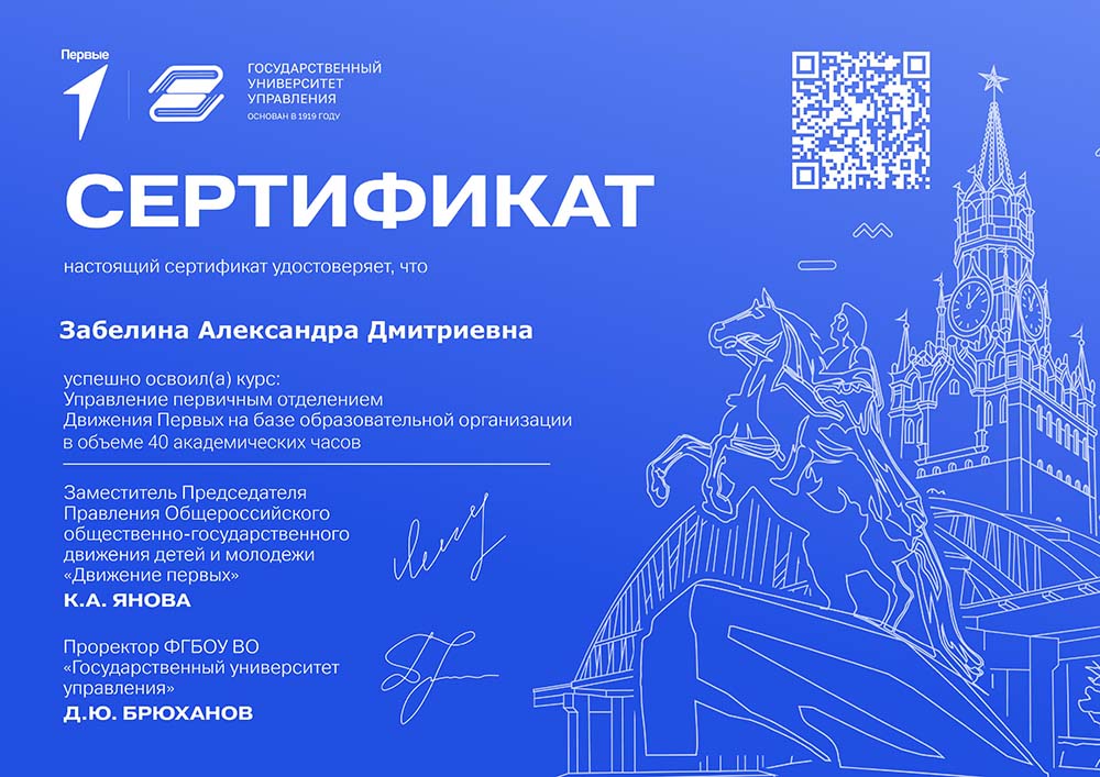 Председатель РДДМ – «ДВИЖЕНИЕ ПЕРВЫХ» ГБПОУ г. Москвы «ТХТК» Забелина Александра Дмитриевна