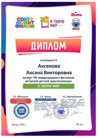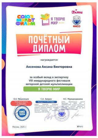 VIII Международный фестиваль авторской детской мультипликации «Я ТВОРЮ МИР!» проходит ежегодно с 2018 года. За годы проведения фестиваля «Я ТВОРЮ МИР» в нём приняли участие свыше 20 000 человек! География охватывает 53 региона нашей страны, а также стран постоянных участников – Республики Беларусь и Республики Казахстан. Фестиваль проводится компанией АО «ЭЛТИ-КУДИЦ» в сотрудничестве с АО «Киностудией “СОЮЗМУЛЬТФИЛЬМ”» с целью содействию развития способностей детей-участников средствами авторской детской мультипликации. Работы участников VIII Международного фестиваля оценивали независимые эксперты, обладающие соответствующей фестивалю квалификации. В декабре 2025 года наш преподаватель спецдисциплин отделения «Анимация» Аксенова Аксана Викторовна принимала активное участие в работе экспертного жюри по оценке детских работ.