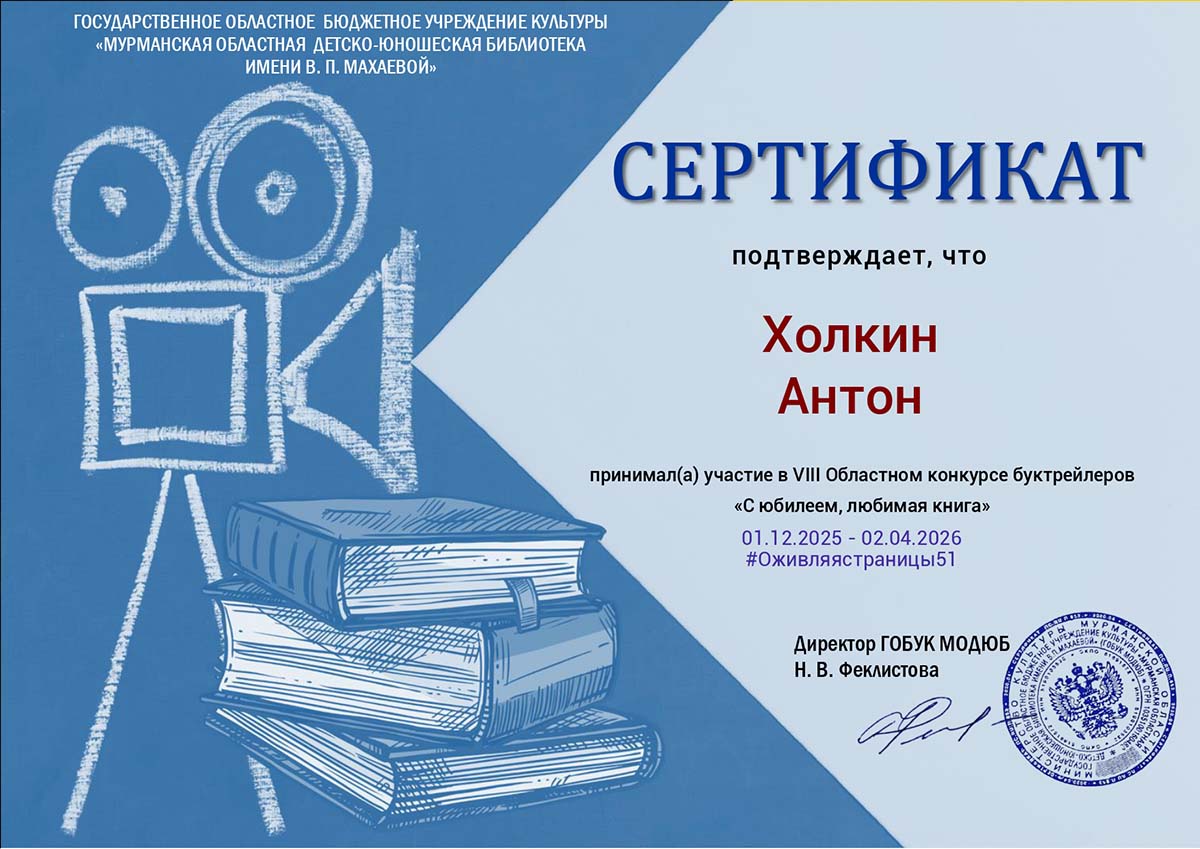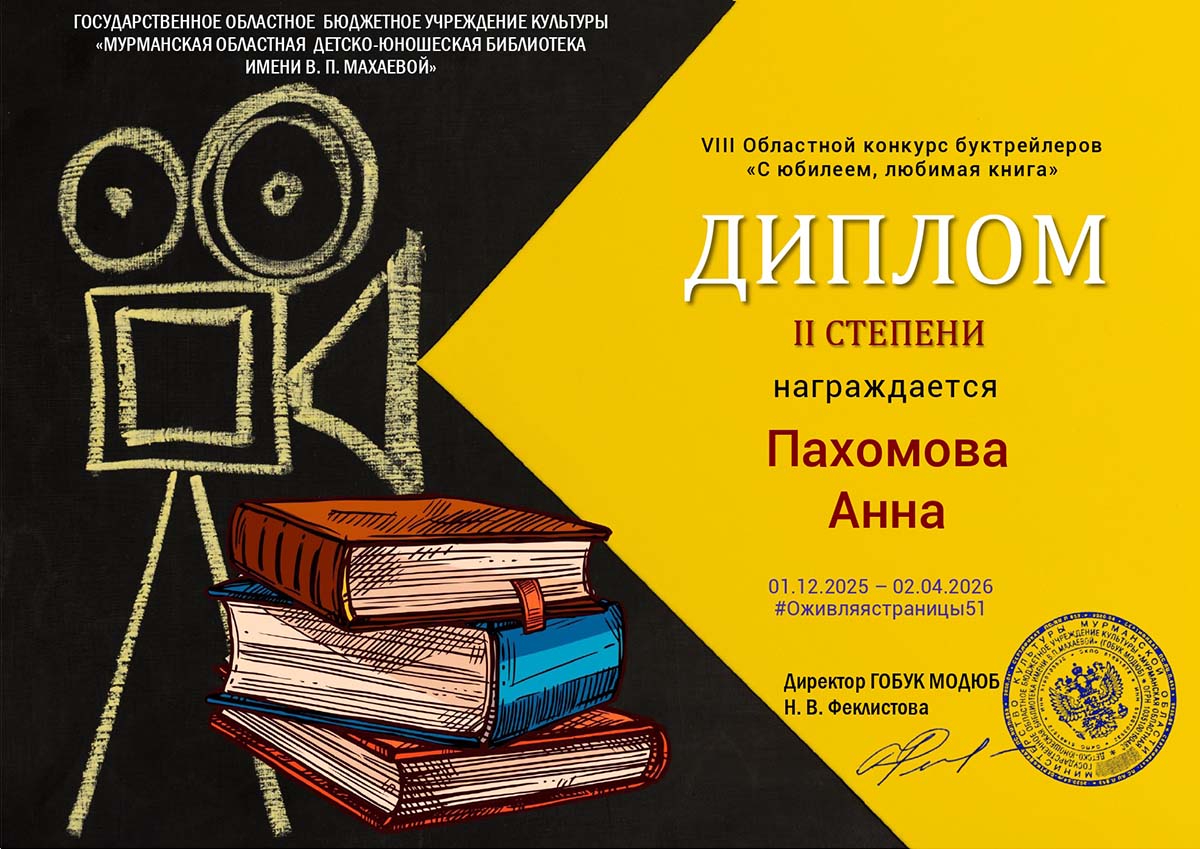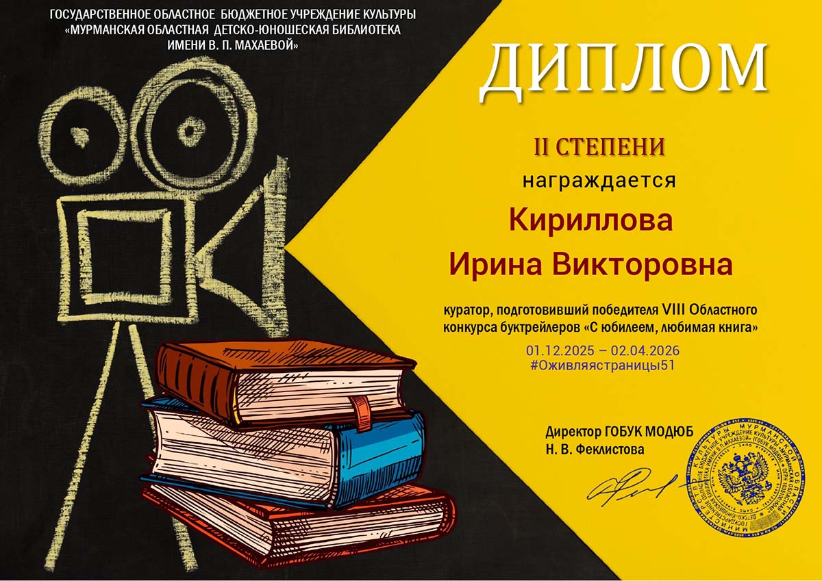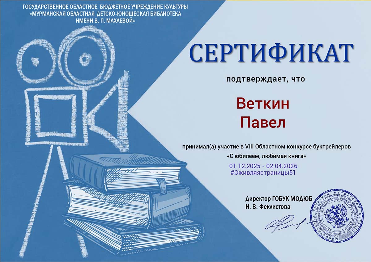 2 апреля 2026 года в Государственном областном бюджетном учреждении культуры «Мурманской областной детско-юношеской библиотеке имени В.П. Махаевой» завершился VIII Областной конкурс буктрейлеров «С юбилеем, любимая книга». ГОБУК МОДЮБ выражает огромную признательность всем участникам, ведь они не просто создавали буктрейлеры, а делали нечто большее – вдохновляли, доказав, что чтение увлекательно и современно. Всем благодарность за душевный и творческий подход к выполнению конкурсных работ. Студенты группы «Оператор информационных систем и ресурсов» приняли участие в конкурсе: Веткин Павел, Пахомова Анна, Холкин Антон. Конкурс стал символом любви к книге и творчеству, объединяет множество талантливых людей!