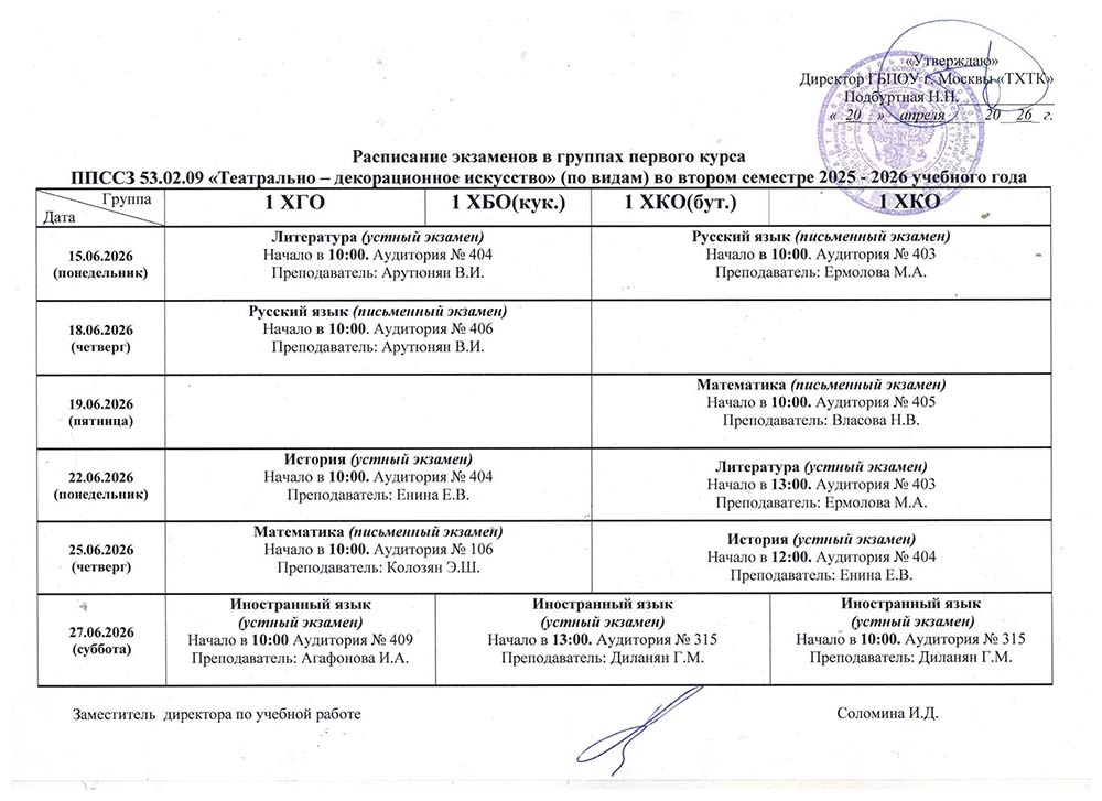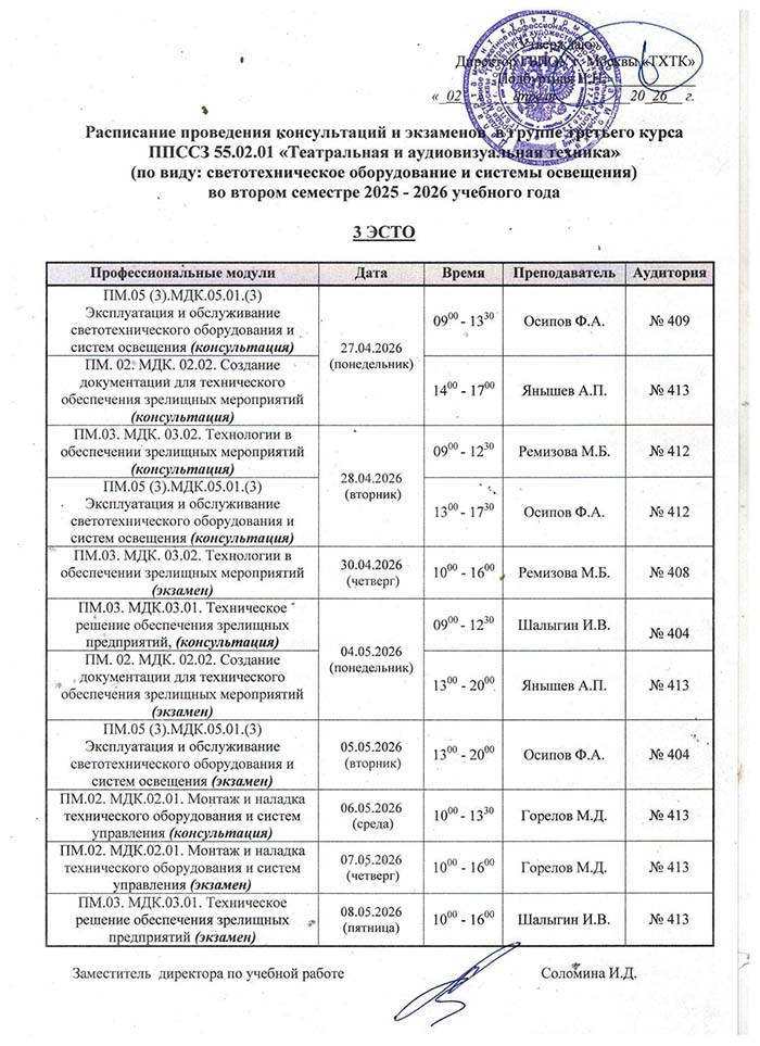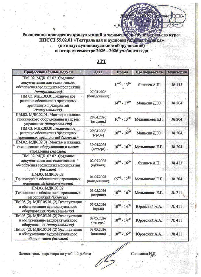 Расписание экзаменов во II полугодии 2025-2026 учебного года в руппах: 1Ан111Ан9-1, 1Ан9-2, 1Реклама1РТ, 1ОС, 1ЭСТО1ХКО, 1ХГО, 1ХБО2Ан9-1, 2Ан9-23Ан11, 4Ан9, 4Ан9(к), 4ХКО, 4ХБО(бут), 4ХБО(кук), 4ХГО, 4ХГО(к), 4РТ, 4ЭСТО, 4ОC, 1ОП, 3Реклама, 3Реклама(к), 3ЭСТО, 3ОС, 3РТ, 2РТ(1), 2РТ(2), 2ОС, 2ЭСТО(1), 2ЭСТО(2), 3Ан9-2, 3Ан9-12Реклама(1), 2Реклама(2)