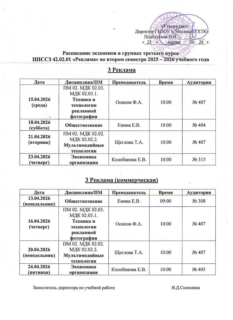 Расписание экзаменациооных просмотров и экзаменов во II полугодии 2025-2026 учебного года в руппах:  4Реклама