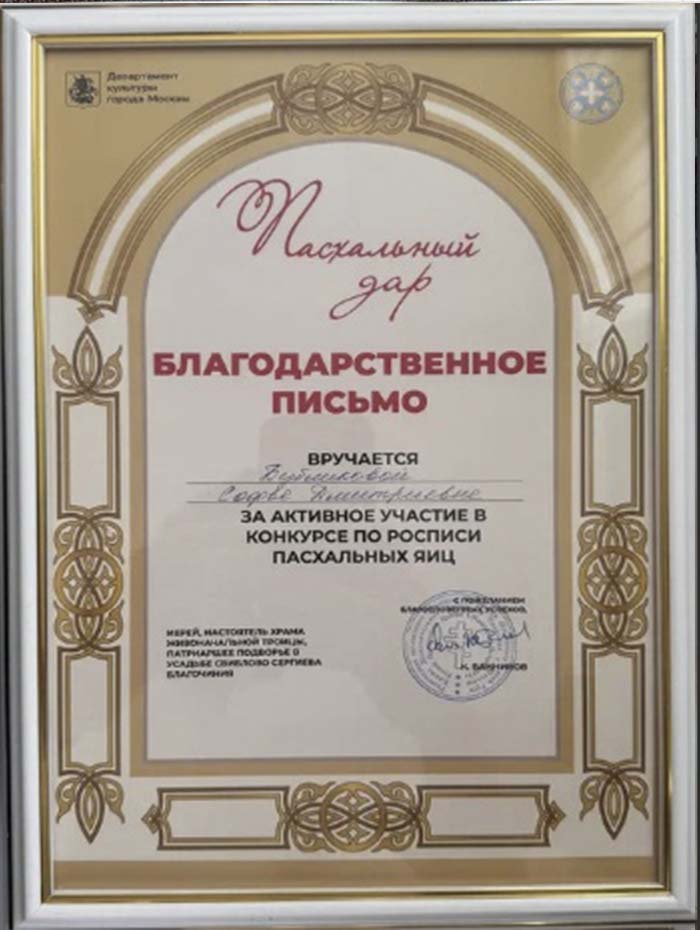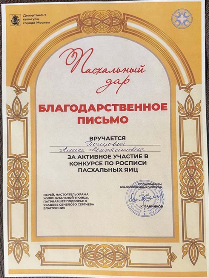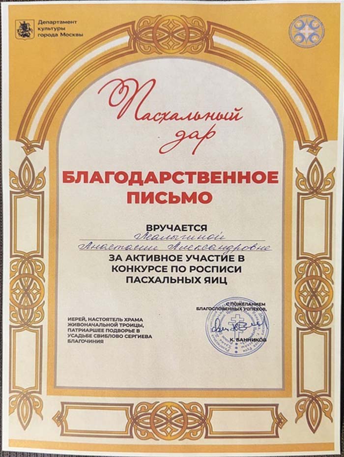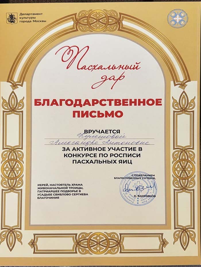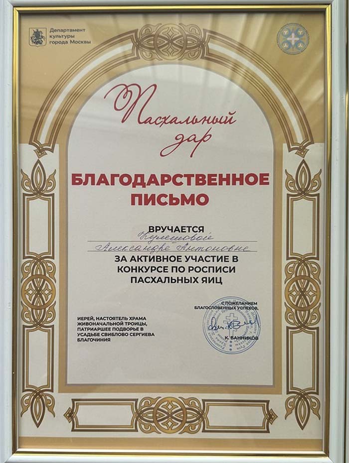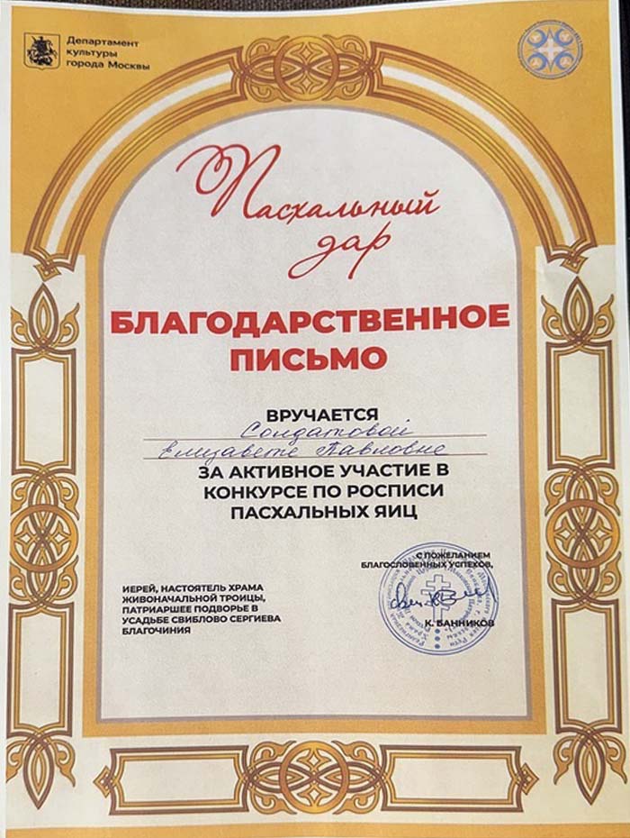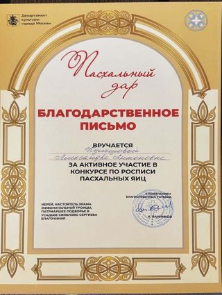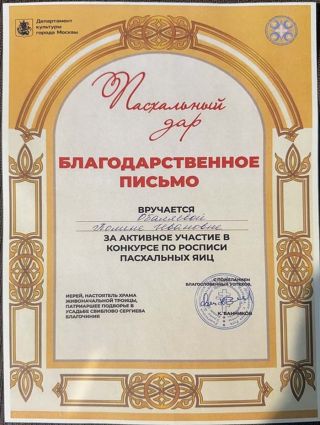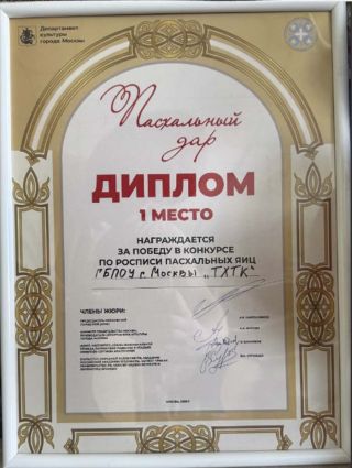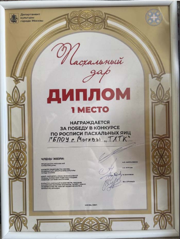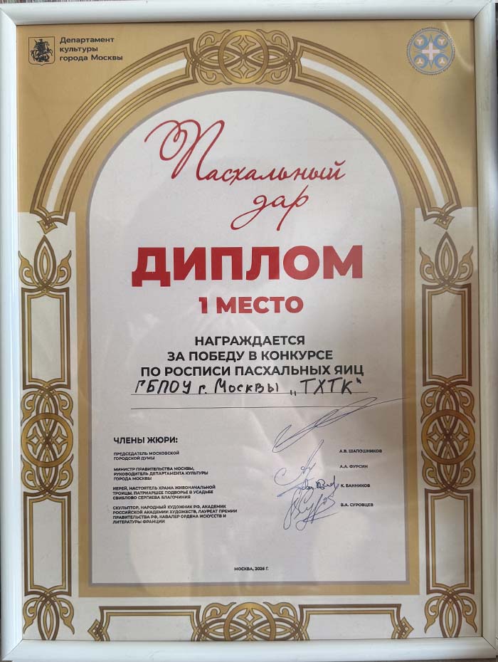 12 апреля 2026 года студенты ГБПОУ г. Москвы «ТХТК», под руководством преподавателя Кожанова-Янга Г.Г., приняли участие в фестивале «Пасхальный дар» при храме Живоначальной Троицы в усадьбе Свиблово в день Светлой Пасхи и победили в Конкурсе по росписи пасхальных яиц . Поздравляем ГБПОУ г. Москвы «ТХТК» с высокой Победой - I местом! Грамоту колледжу подписали Председатель Московской городской думы А.В. Шапошников, Министр Правительства Москвы, руководитель Департамента культуры г, Москвы, А.А. Фурсин, иерей, настоятель Храма Живоначальной троицы, Патриаршее подворье в усадьбе Свиблово Сергиева Благочиния К.Банников, скульптор, народный художник РФ, академик РАХ В.А. Суровцев. Поздравляем! (Награждение>>>)