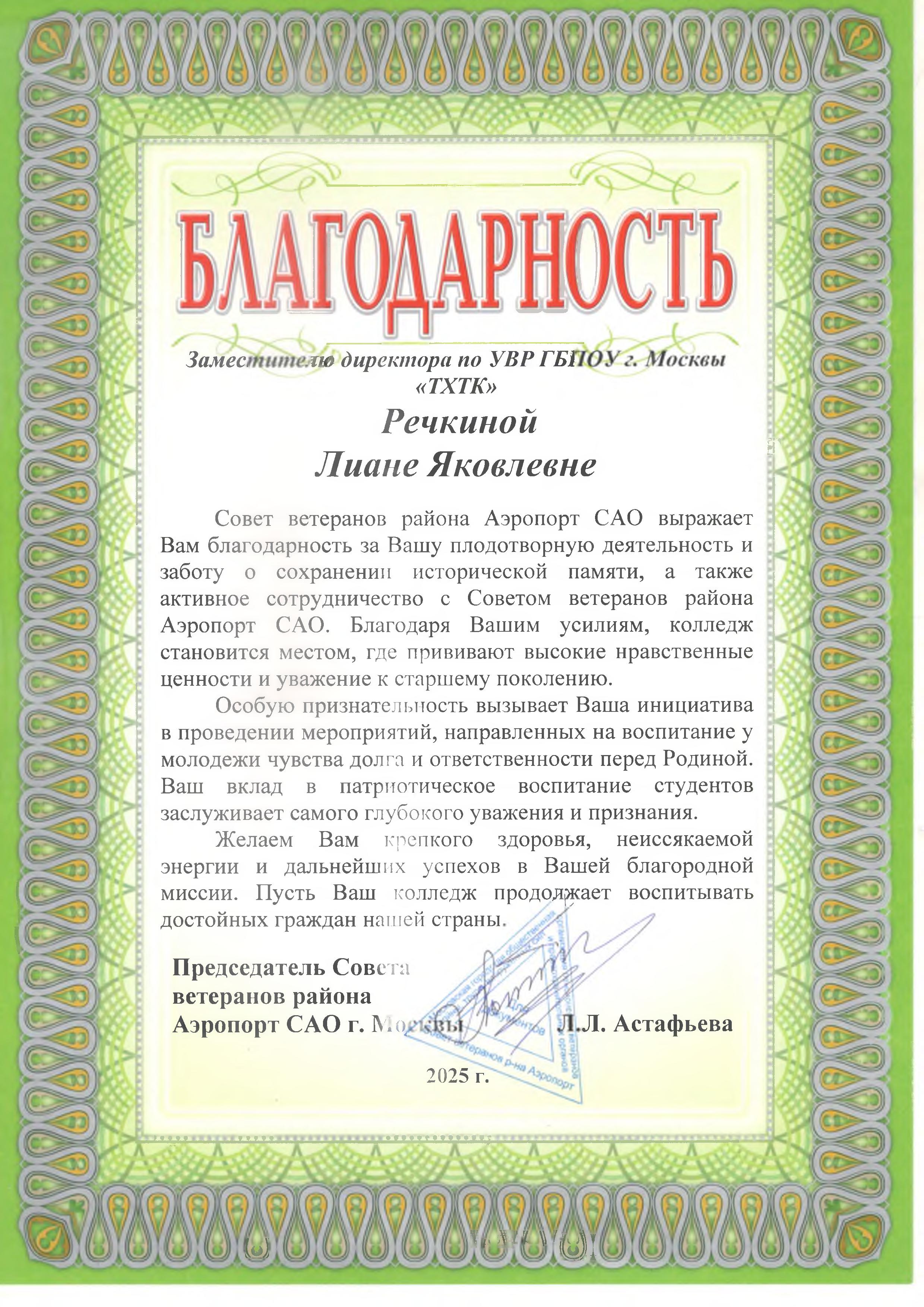 25 декабря 2025 года Председатель Совета ветеранов района Аэропорт САО г.Москвы Астафьева Людмила Леонидовна выразила благодарность директору колледжа Подбуртной Наталье Николаевне и всему коллективу ГБПОУ г.Москвы "ТХТК" за плодотворную деятельность и заботу, сохранении исторической памяти, а также активное сотрудничество с Советом ветеранов района Аэропорт САО.Благодаря усилиям администрации,студентов и преподавателей колледжа ГБПОУ г.Москвы "ТХТК" стал местом, где прививают высокие нравственные ценности и уважение к старшему поколению.Людмила Леонидовна, отметила, что вклад колледжа в патриотическое воспитание студентов заслуживает самого глубокого уважения и признания!