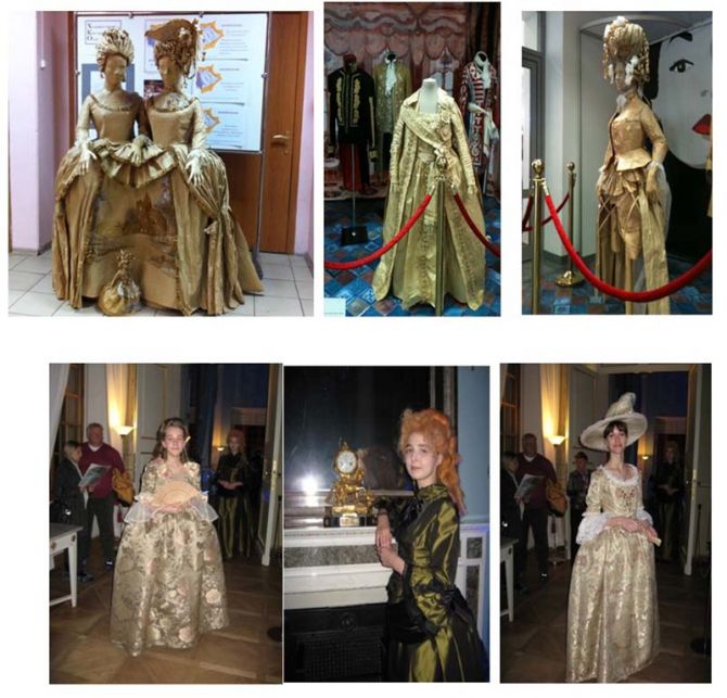 Поиск образного решения театрального костюма прорабатывается в макете из бумаги. Удачные работы, даже на этом этапе, становятся музейными экспонатами. Костюмы, выполненные в материале, студенты часто демонстрируют в сочетании с исторической прической, головными уборами и аксессуарами на разных музейных площадках Москвы и Московской области.